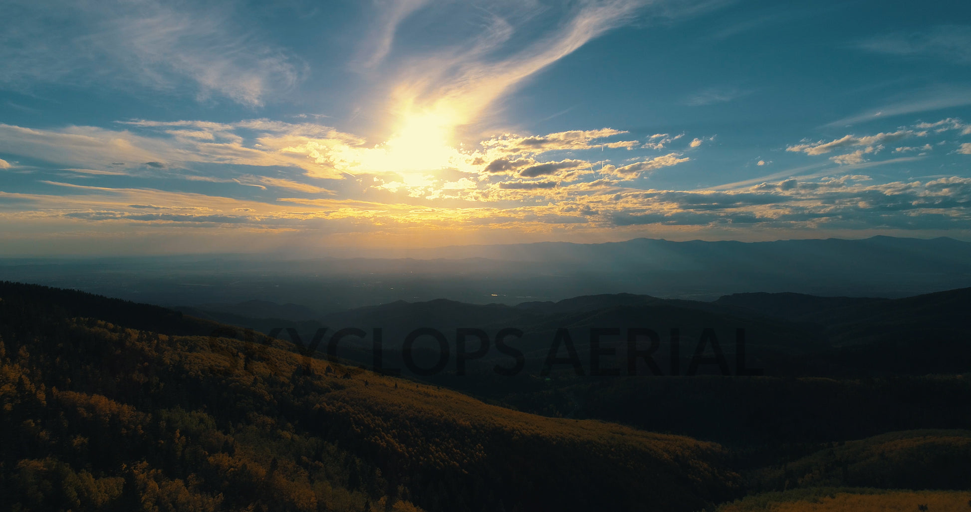 Vídeo de archivo de la puesta de sol en la montaña de Santa Fe, Aspen, cerca de Santa Fe, Nuevo México. Imágenes aéreas con dron en 4K, 30 segundos de duración. La marca de agua se elimina después de la compra.